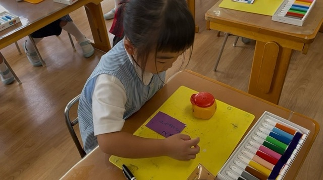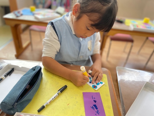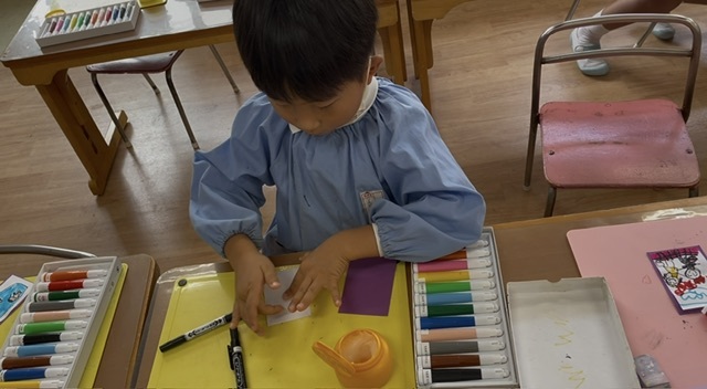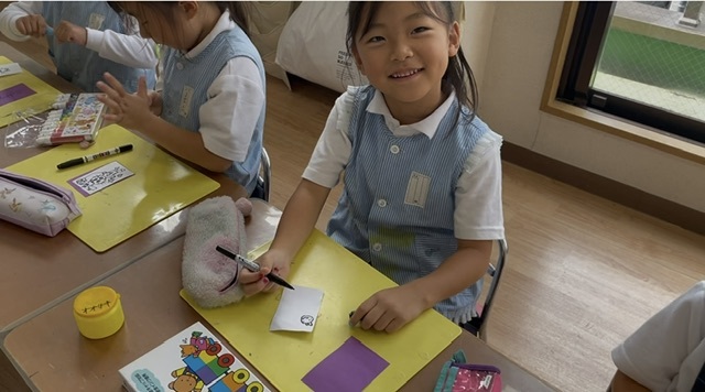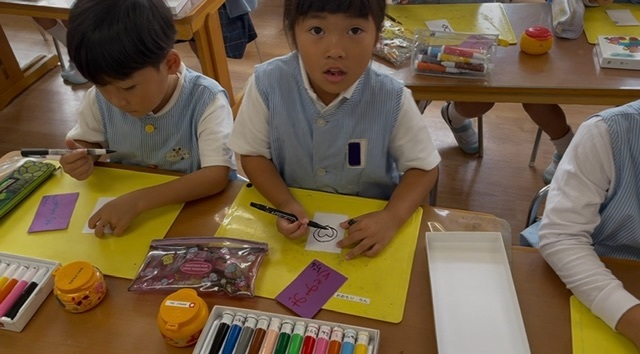 自分の好きなものや、お泊り保育で楽しみにしていることなどの絵を描いて、裏には「おまもり」と自分の名前を書きました( ◜ᴗ◝)
