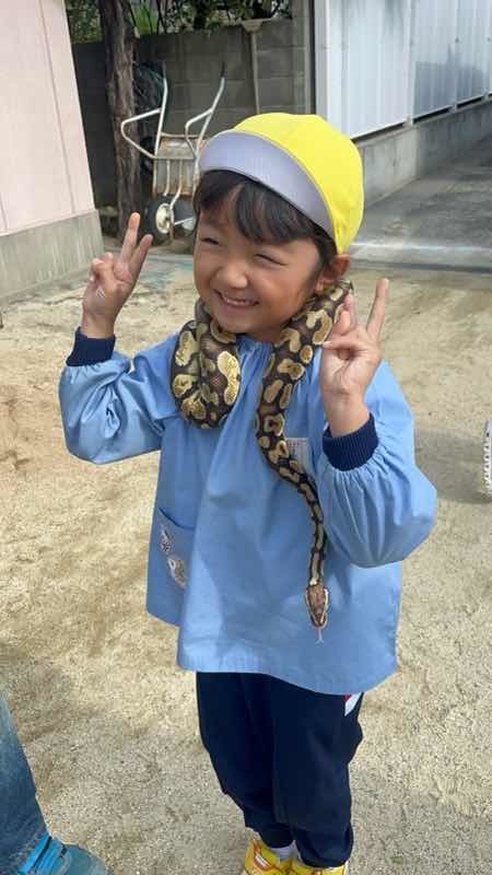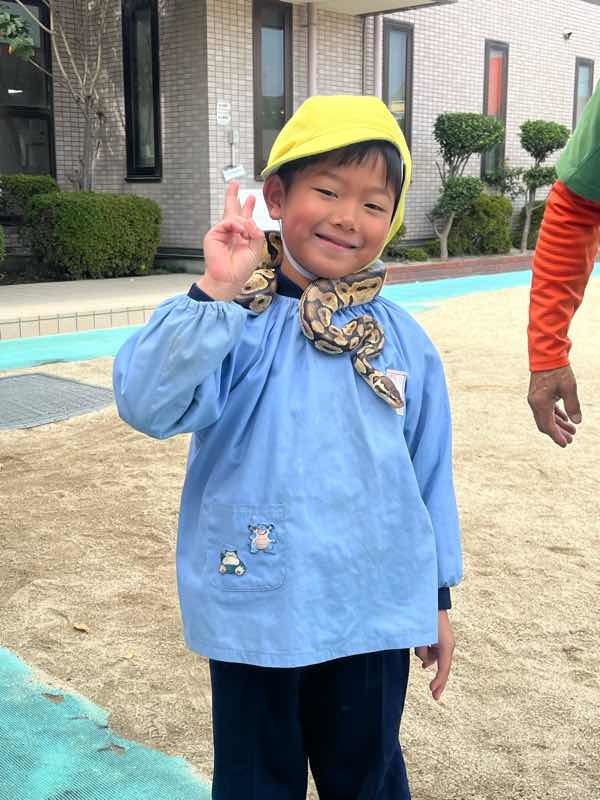 蛇の体温、感触など肌を通して感じていました!「つるつる〜!」「怖いから触るだけ!」と、楽しんでいました!