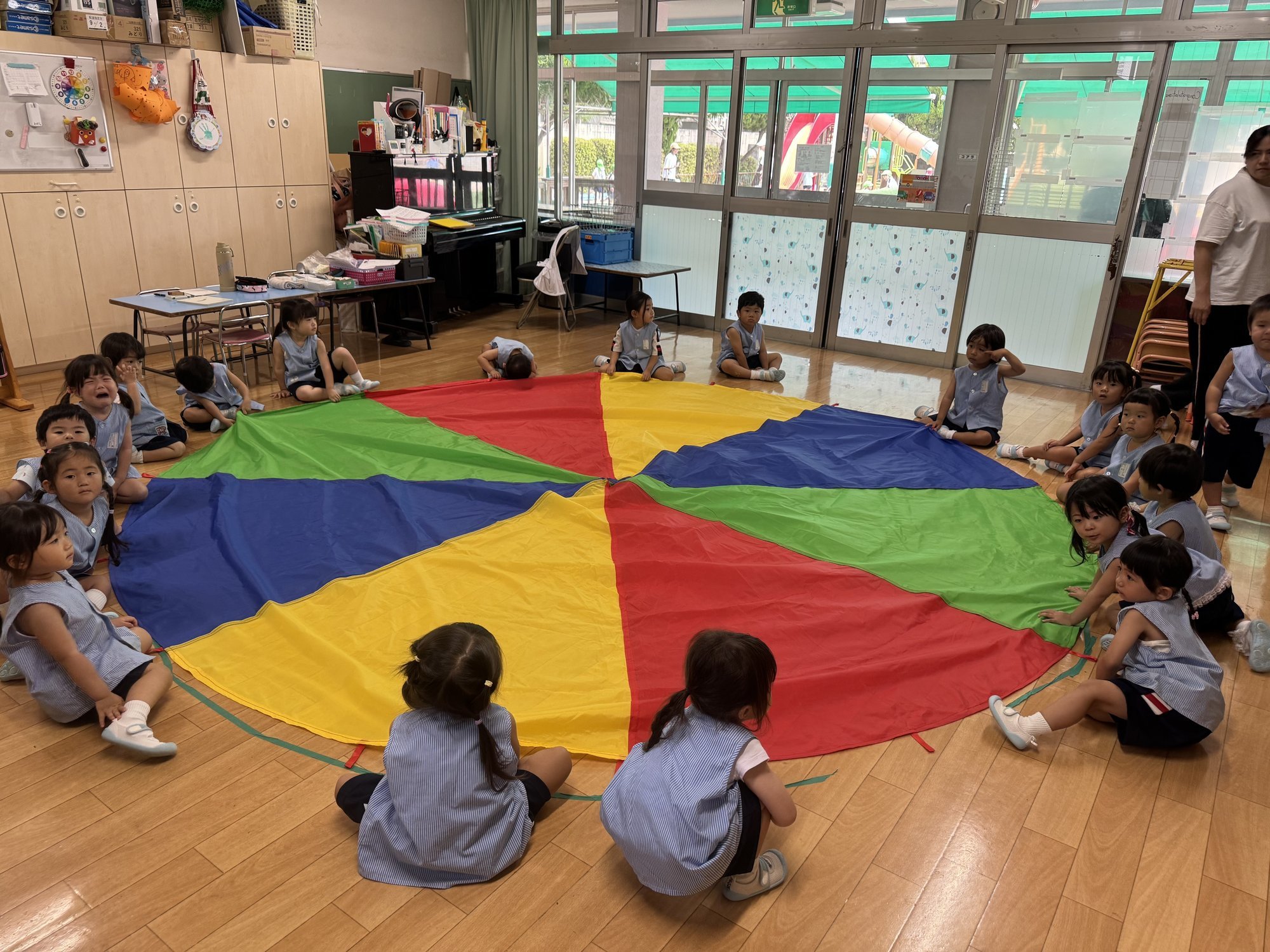 運動会は年少組さんと一緒にパラバルーンをお披露目します。お兄さん、お姉さんと練習頑張っています。楽しみにしていて下さい。