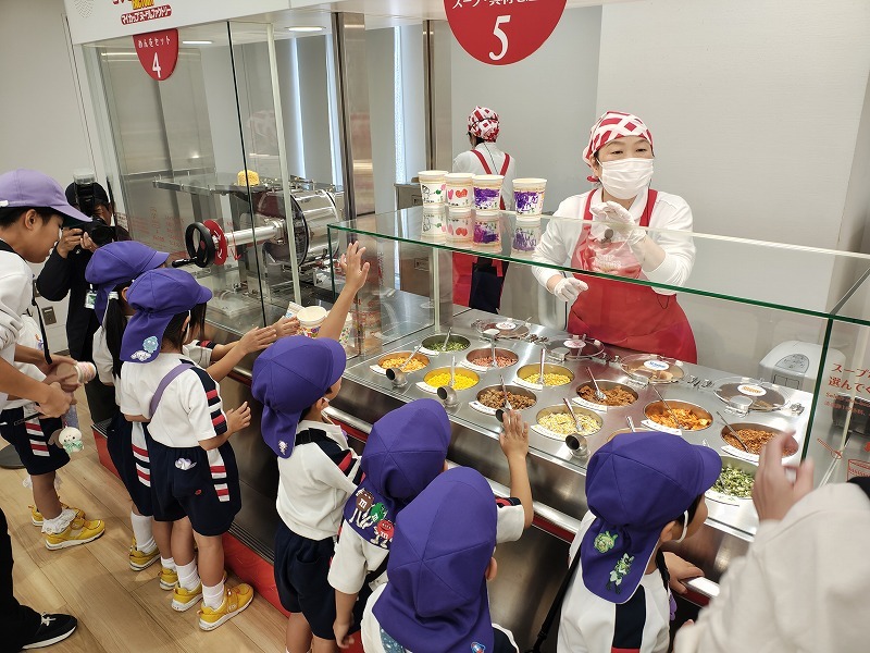 個性あふれるカップが出来上がったら、いよいよスープと具材を選びます。たくさんの種類を前に、真剣に悩む子どもたち。