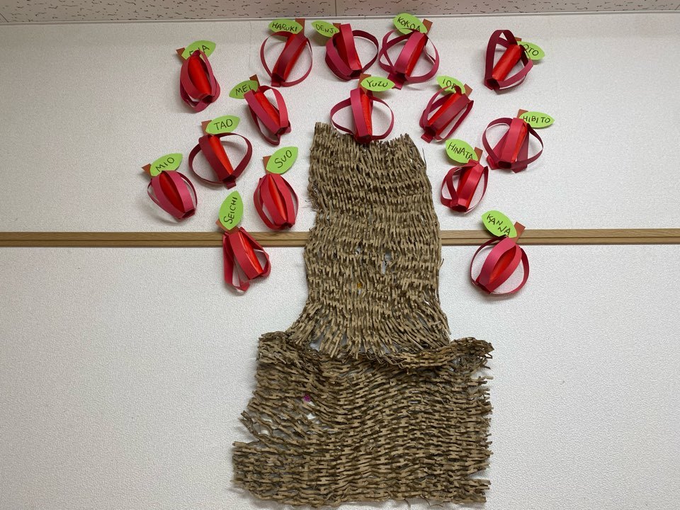 まん丸りんごや、スリムなりんご、よく見ると個性豊かです♡みんなのりんごを集めて、りんごの木になりました(^O^)