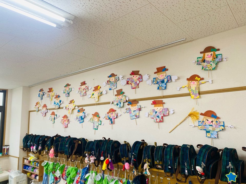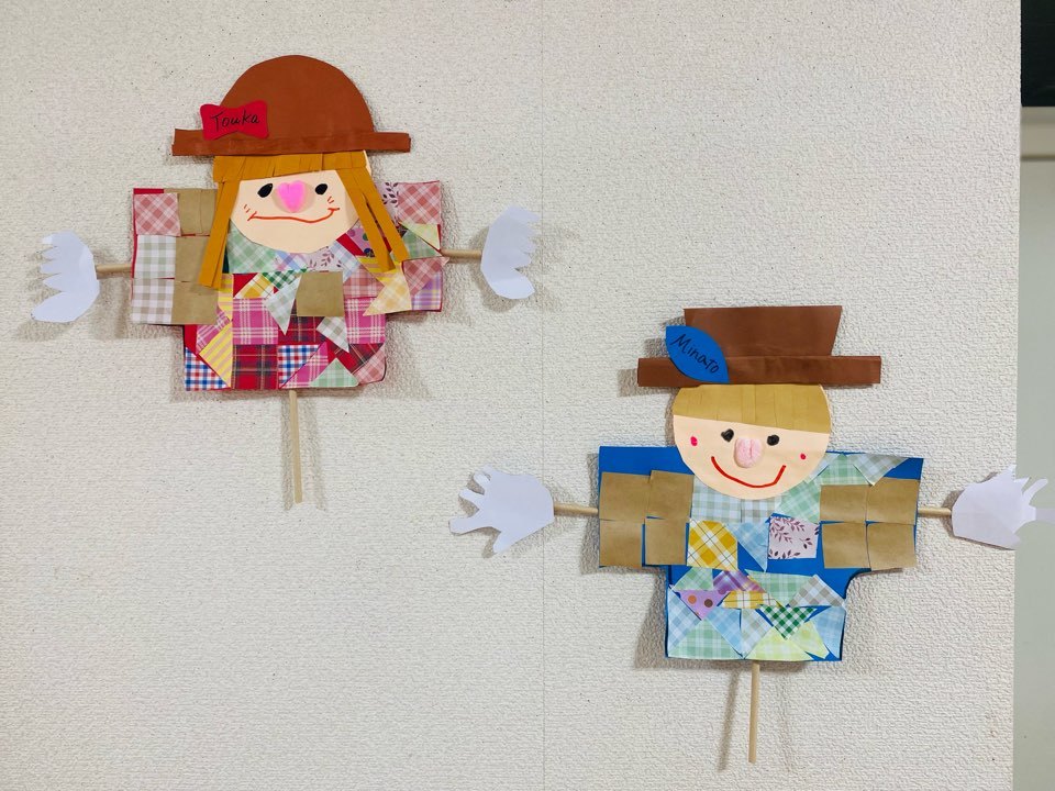 今回は海外風のかかし作りに挑戦しました!かかしの服はパッチワークのようなやり方で色々な柄を貼りあわせました!そして帽子を折り前髪をハサミで切った後可愛いお顔を描いてくれました^ ^