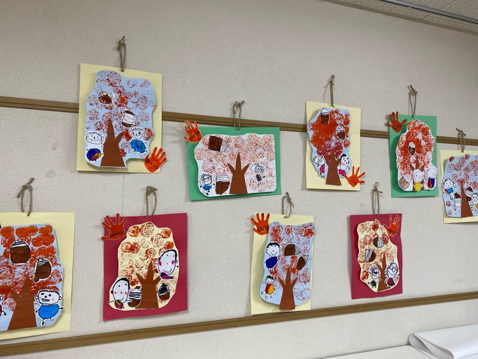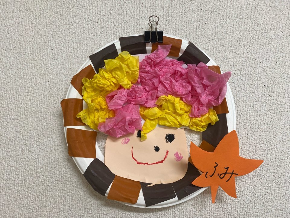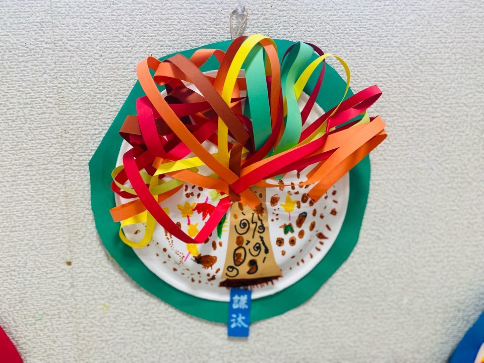 紙皿に木を張り回りに紅葉の色をした細長い画用紙をたくさん貼って、1本ずつくるくる回しながら貼っていき紅葉の木を作りました!