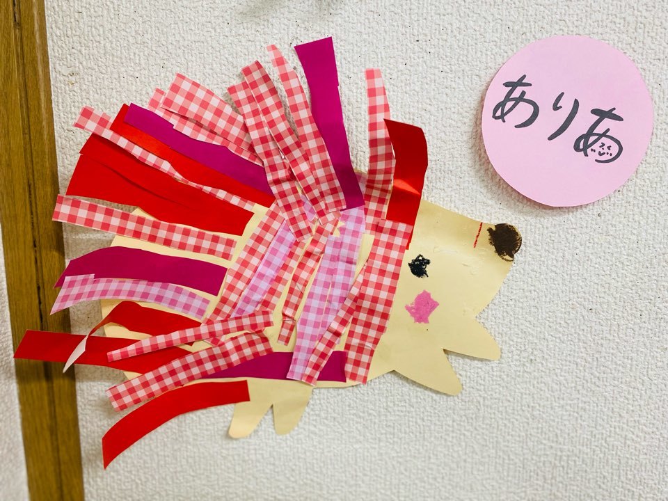 色んな柄の折り紙を細く切ってハリネズミの体にたくさん貼りました!