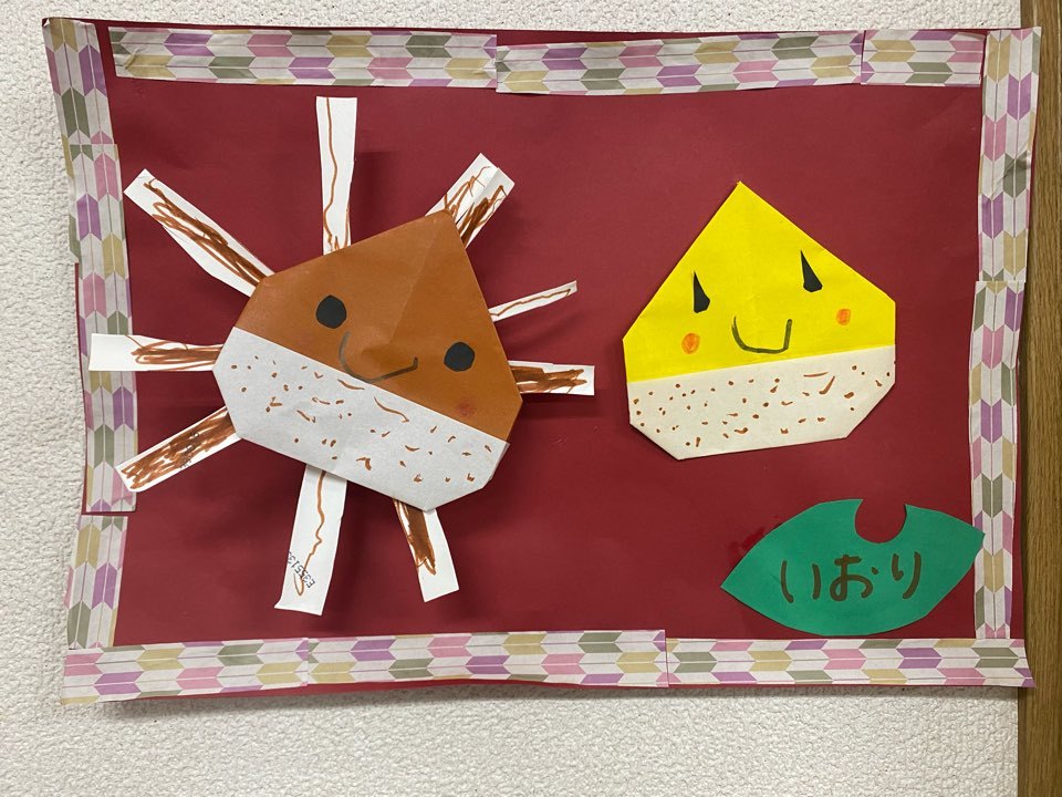 最初は花火みたい!と思っていたお友だちも多かったのですが、折り紙で折った栗を上に重ね合わせると、「トゲトゲの栗になった!」と、イメージをしっかり持って仕上げていきましたよ!