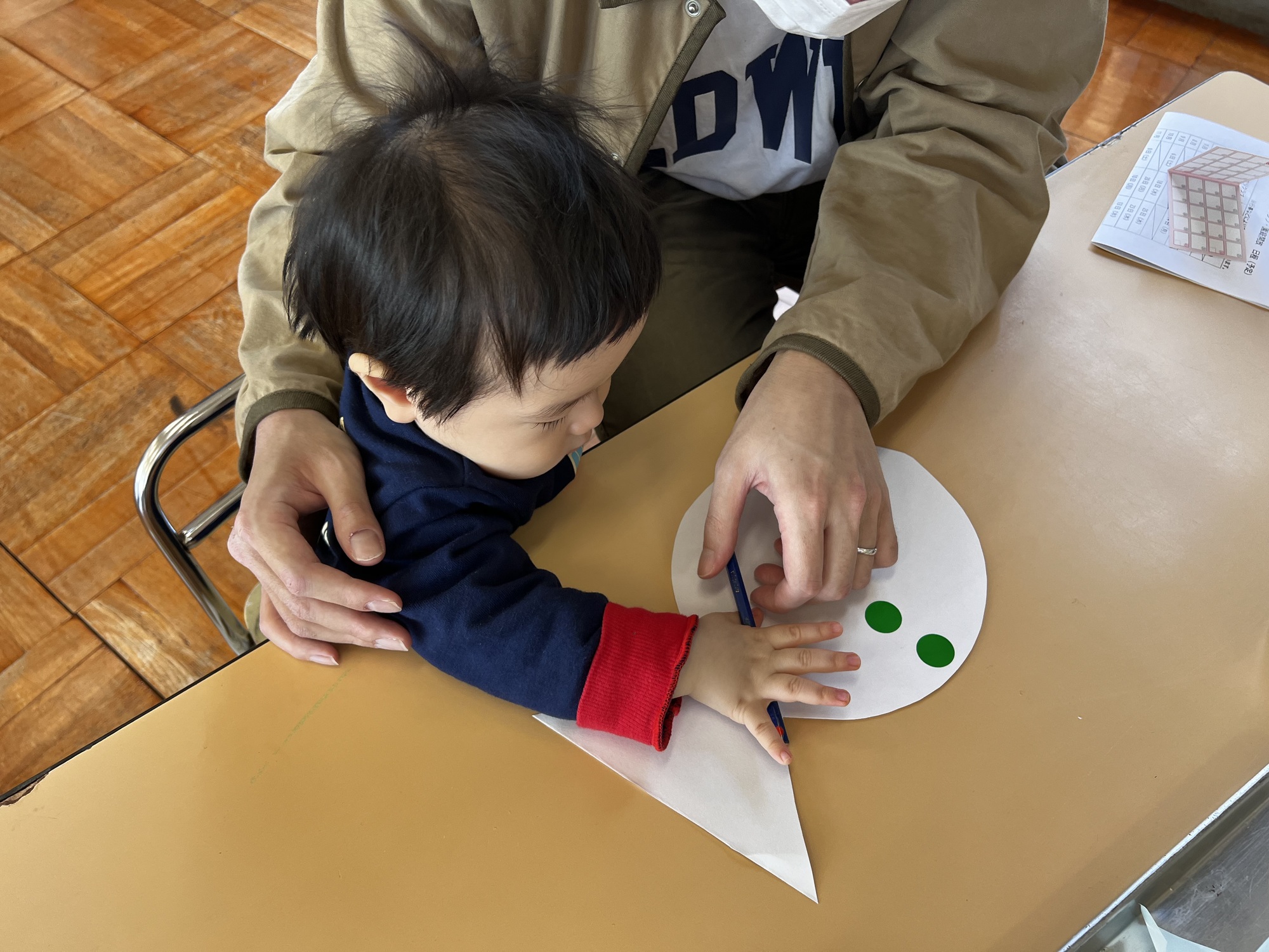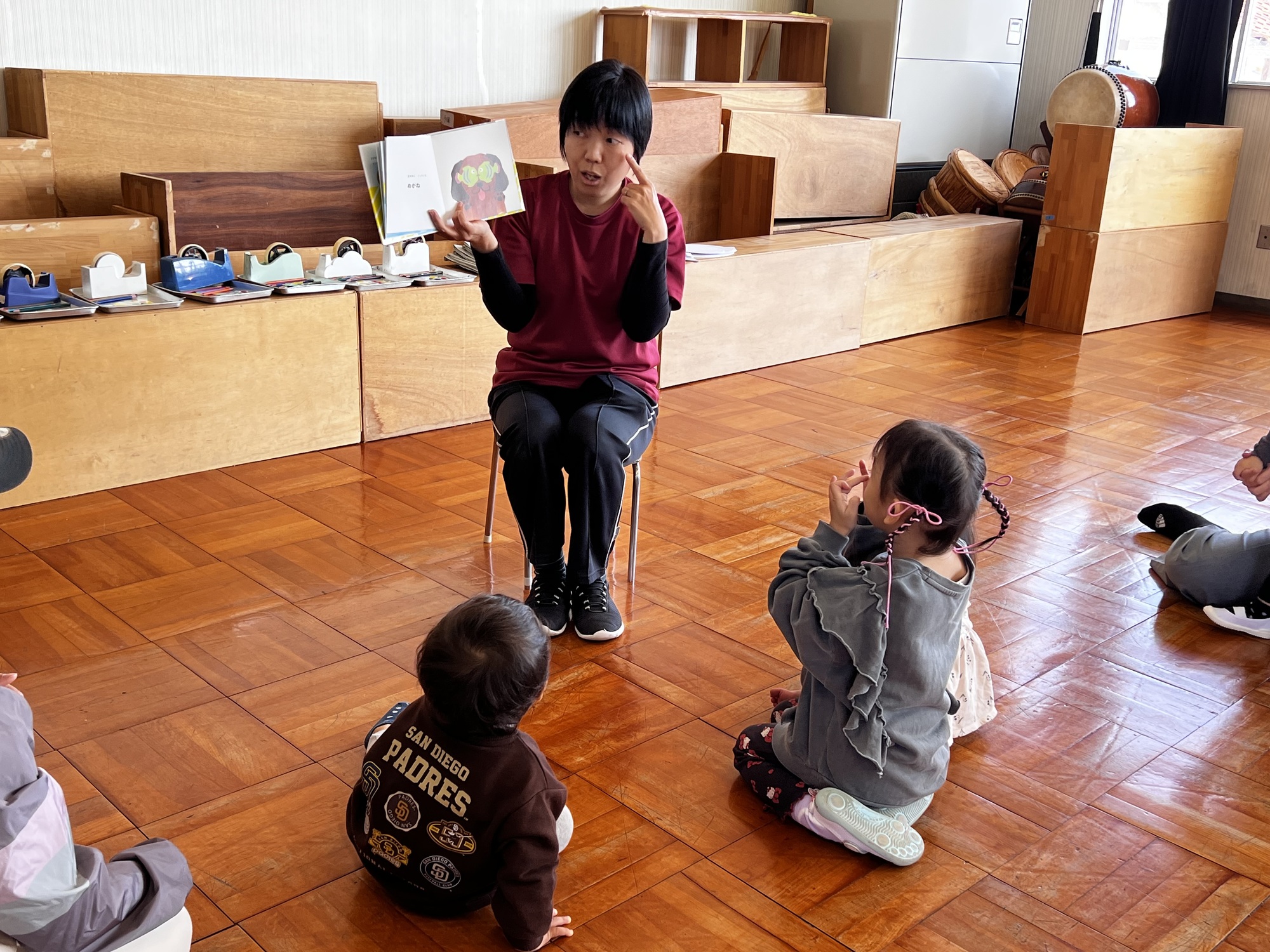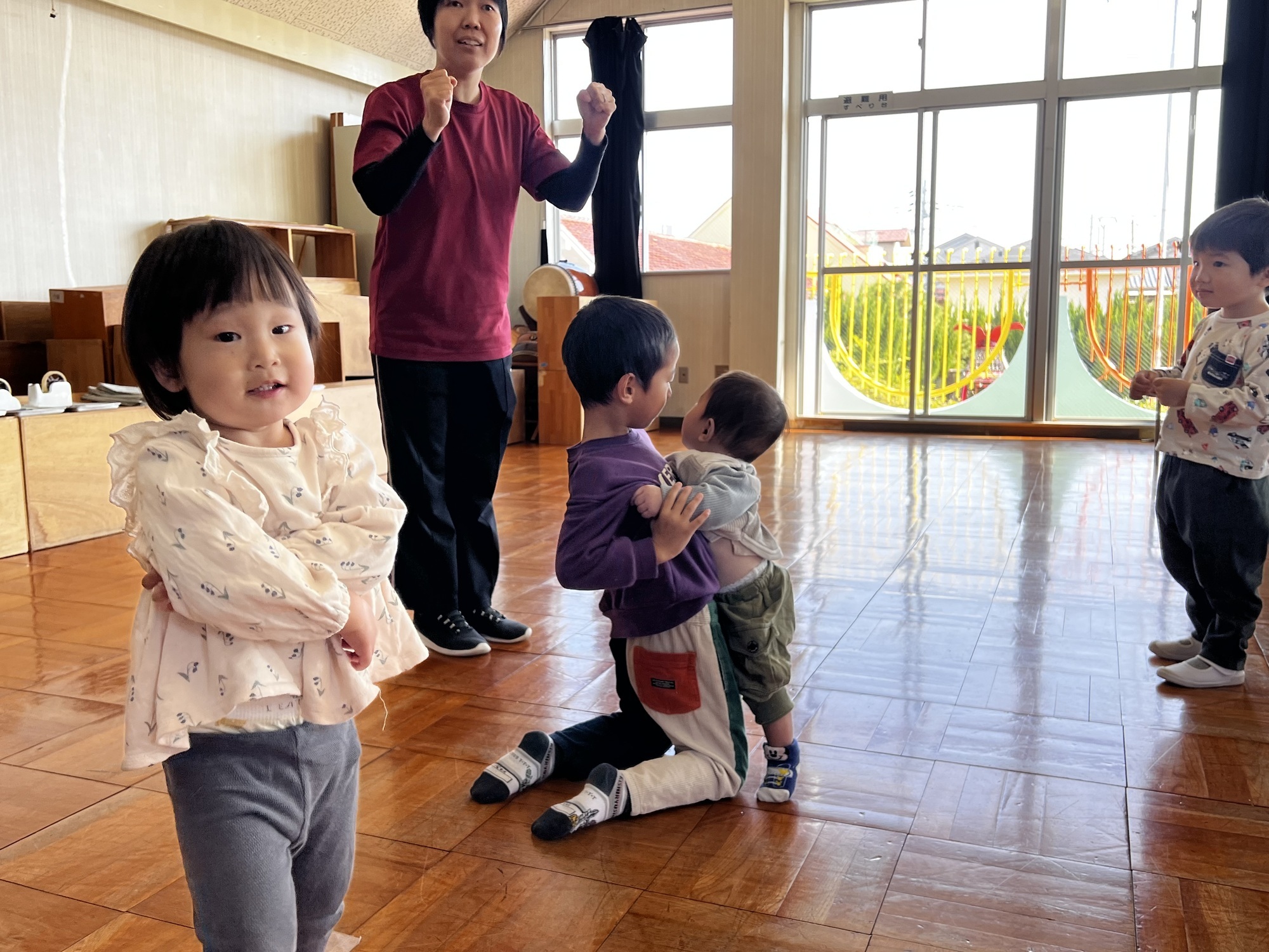 朝のお歌「どんぐりころころ」「まつぼっくり」では身振り手振りをつけて歌い、その後の絵本「さかながはねて」もお歌に合わせて楽しく見ることができました!