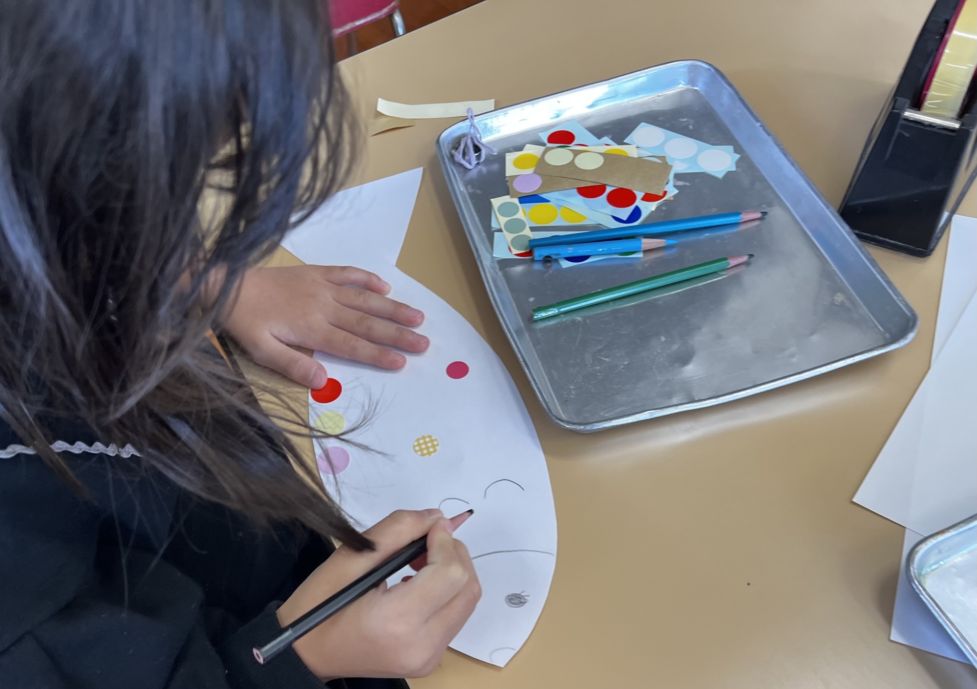 丸シールで色が鮮やかな魚にしたり、色鉛筆で模様をつけたしたりしながら、素敵な魚の完成♪