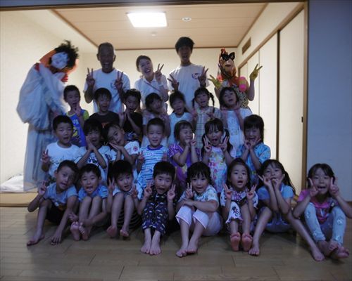 阿保神社の神様、アボジーとアボジーナが!音楽に合わせて踊り出す神様にびっくりして、ちょっと泣いちゃう子もいましたが、最後はお面を取って先生だと気づき、一安心していました(*^_^*)