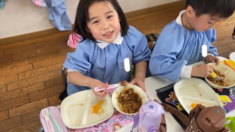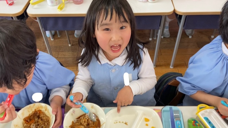 と、新しいクラスで嬉しそうに給食を食べる