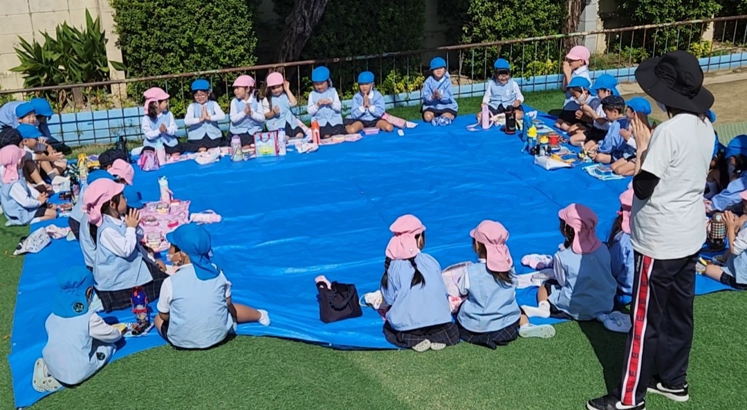 おまちかねのお昼になり、お天気も良かったので、芝生の上にシートをひいて、ピクニック気分で桃組さんと一緒にたべましたよ☆