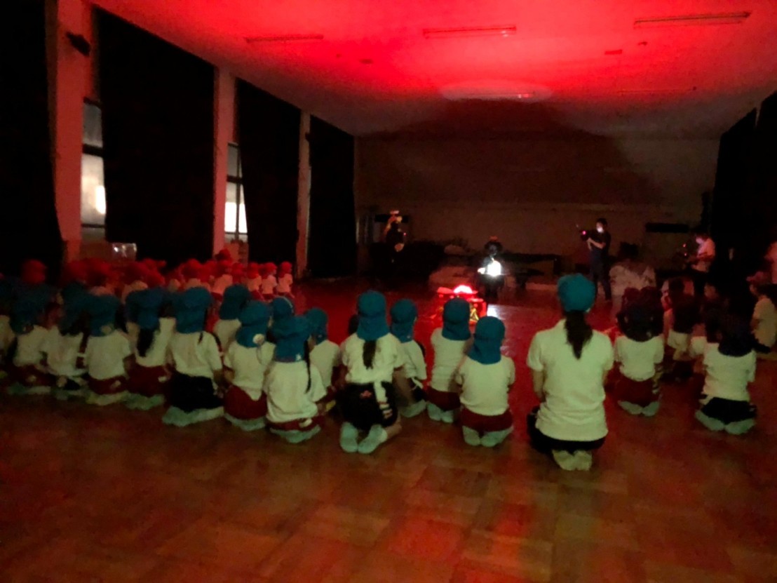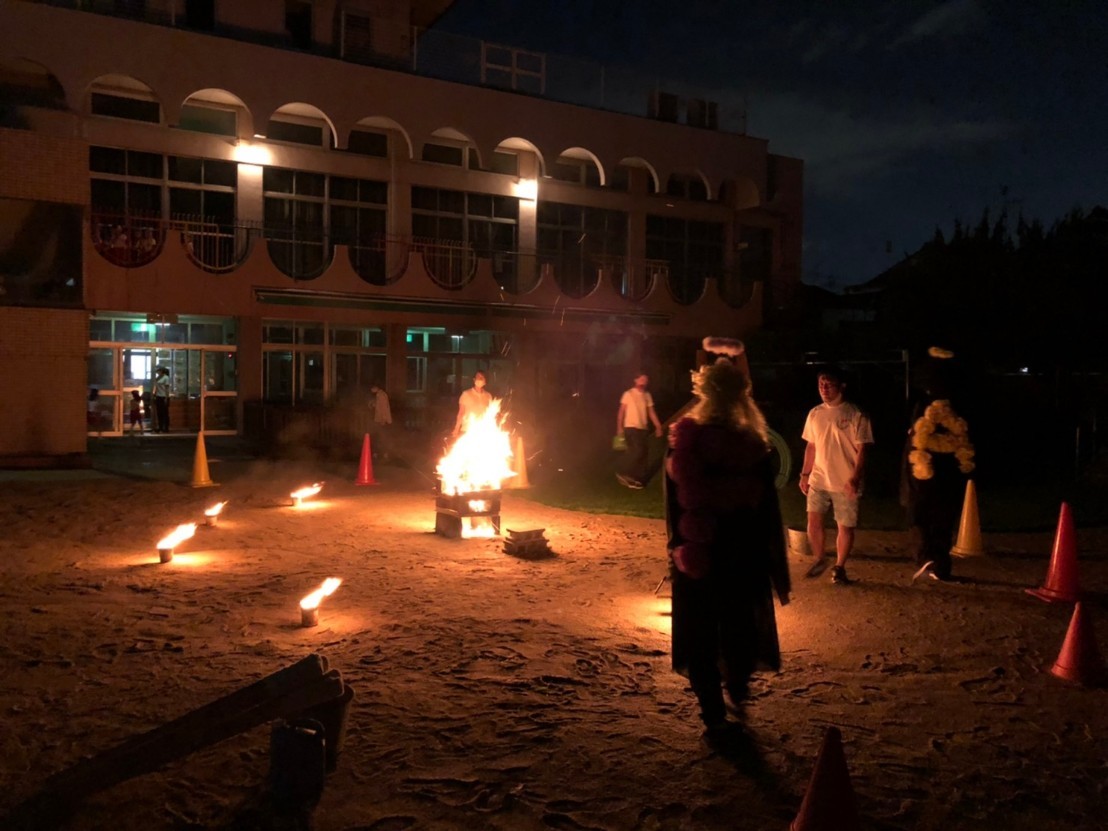 さあ次は雨だったのでホールに行ってキャンプファイヤー!