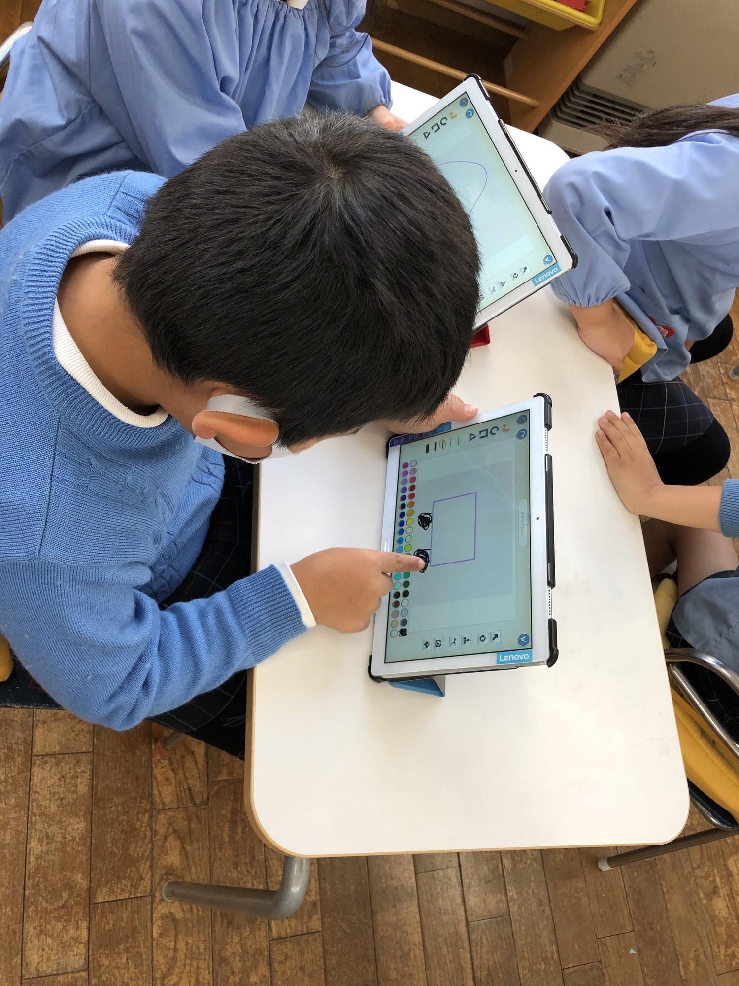 今週はプログラミングがあり、前回のプログラミングの応用で斜めの動き方を学んでから、タブレットに自分で車が通る道をかき、自分だけの車をかき自分でかいた道路の上を走るということをしました!