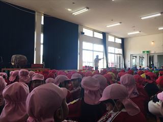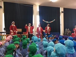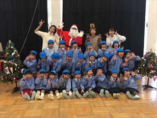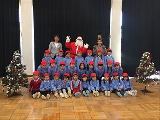 ひかり幼稚園もこの日はクリスマス会!ホールも飾り付けやツリーが置いてありました☆先生サンタが現れて手遊びやペープサートを見ましたよ♪