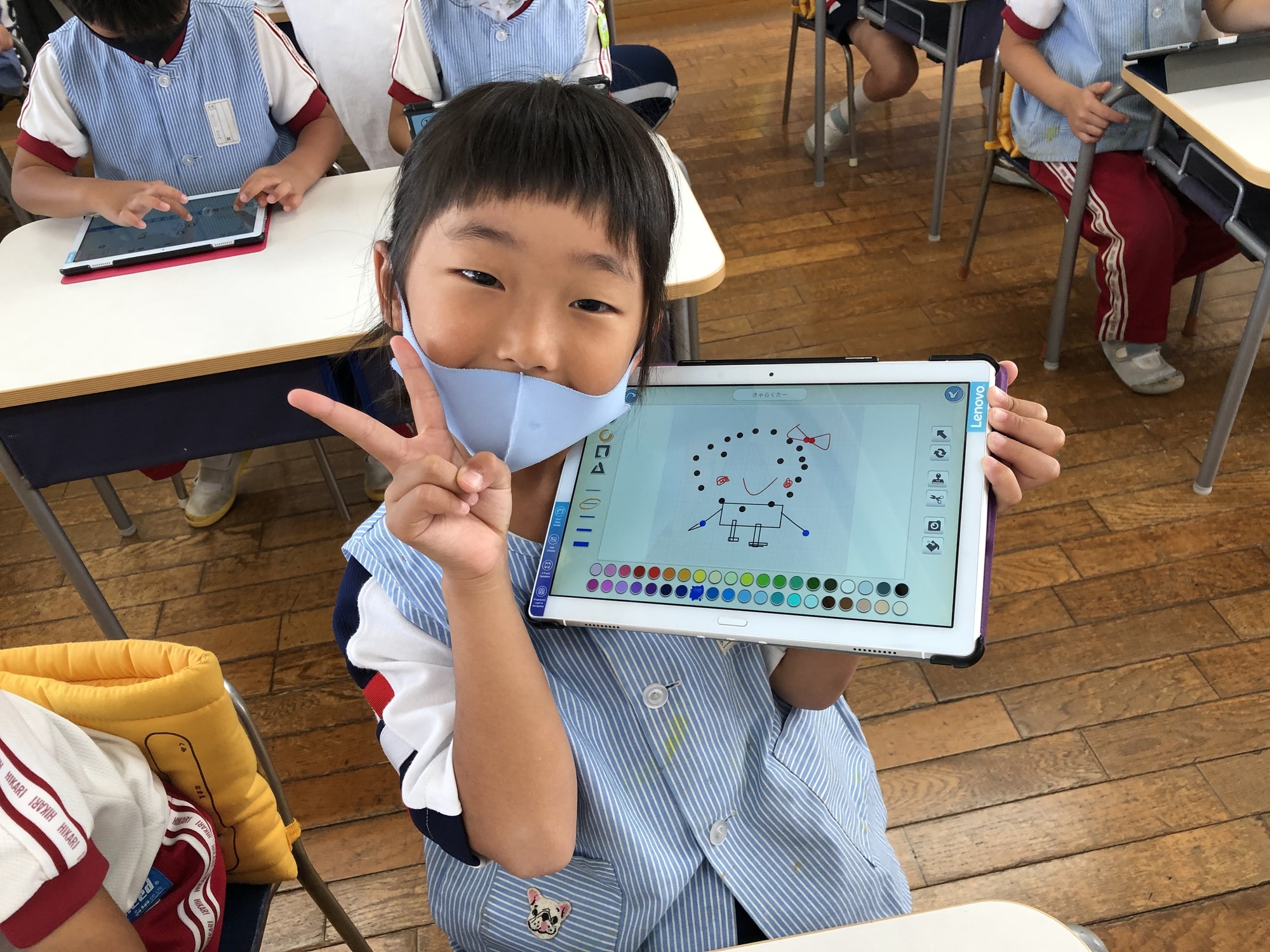 その後、みんなで未来にどんなロボットがあったら便利かを意見を言い合い、タブレットで描いて動かしてみました!