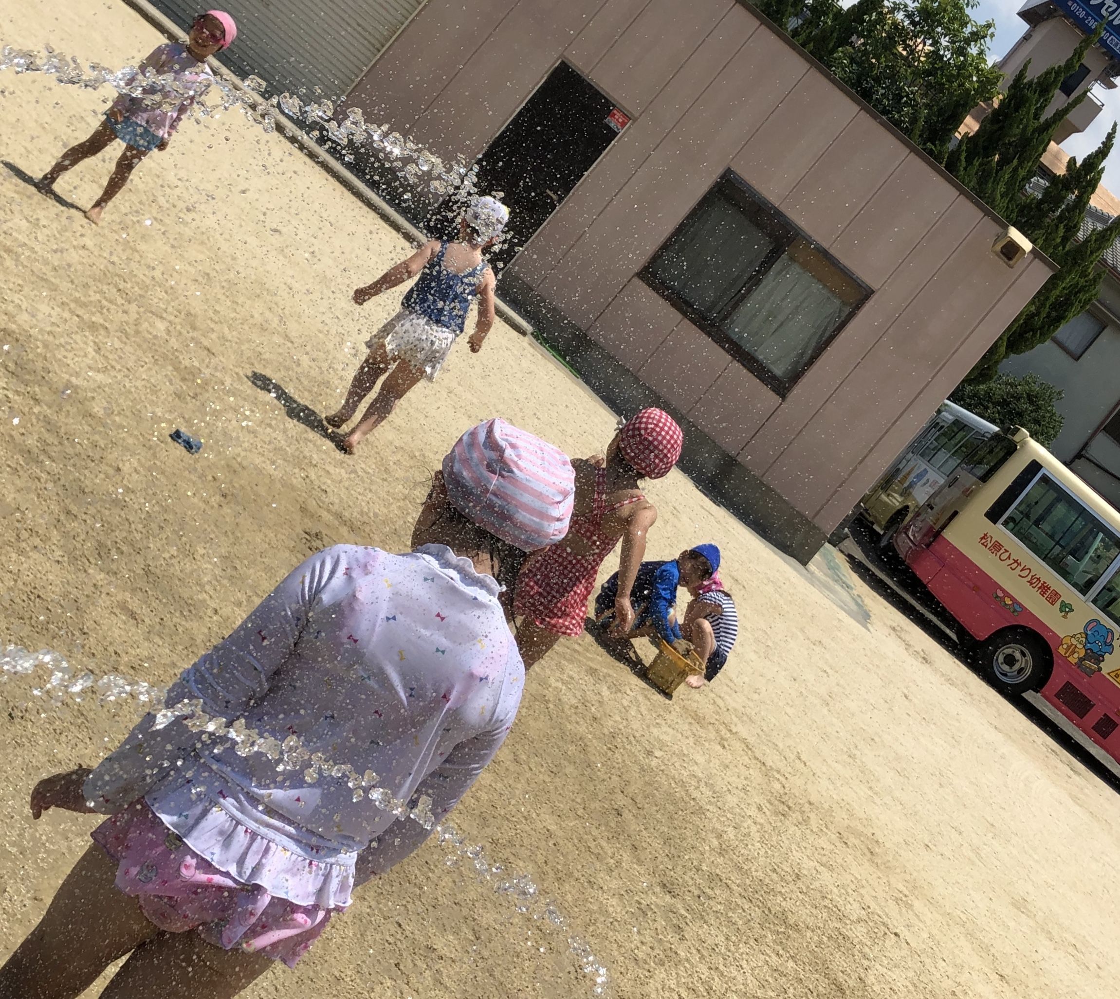子どもたちは「水かけてー」と言いながら、かけられると「キャーキャー」言って楽しそうに走り回っていました^ - ^
