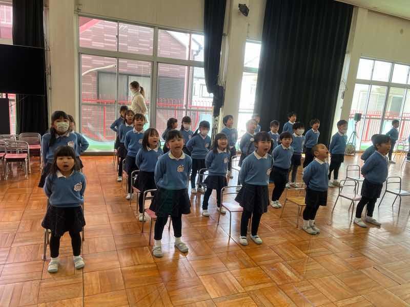 ホールで証書の受け取り方やお別れの言葉、歌を練習中です!「♫ドッキドキドン1年生〜!」「さよならぼくたちの幼稚園〜♫」と綺麗な声がホールに響いています!
