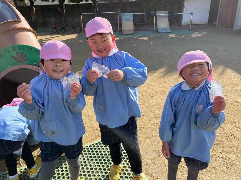 とある日のお外遊び!なんと、氷が!前日の雨水が滑り台に溜まり凍っていました⭐︎「冷たい!」「キラキラや!」「落としたらパリンって音した!」と氷の感触を楽しんでいました!
