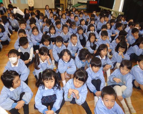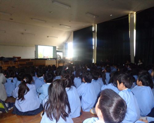 外でのお話が終わると、ホールに集まり、防火のDVDを見ました。