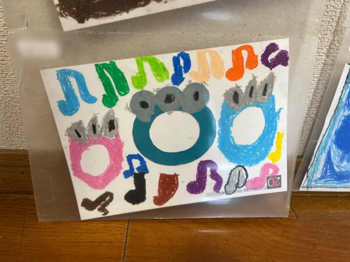 「どんなものにしようかな?!」「これカエルにみえる!」と、形を見ながらクレパスを使って書き込んでいきます!