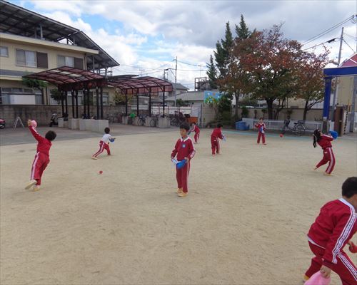 今日の体育指導はボール投げ!!