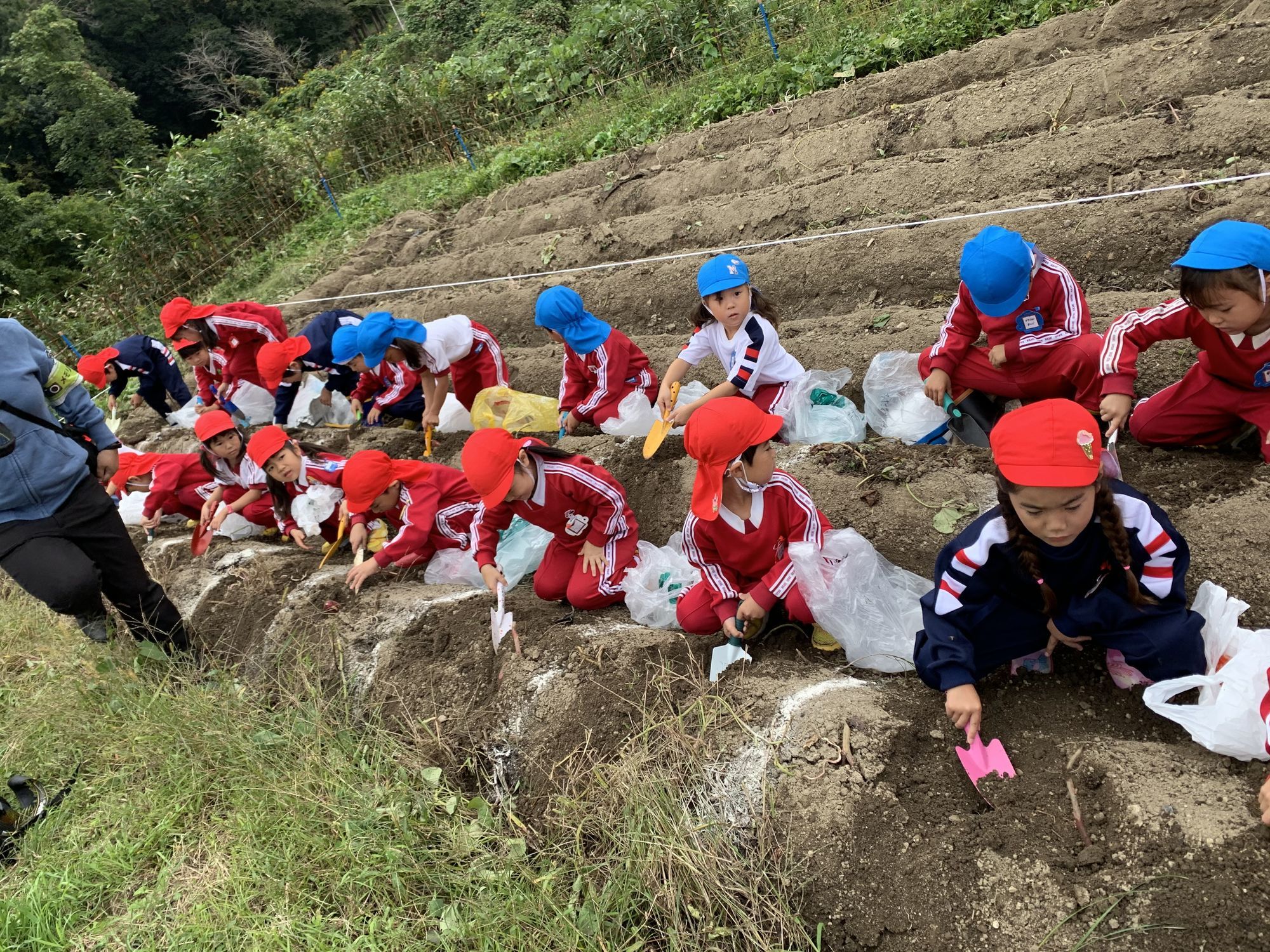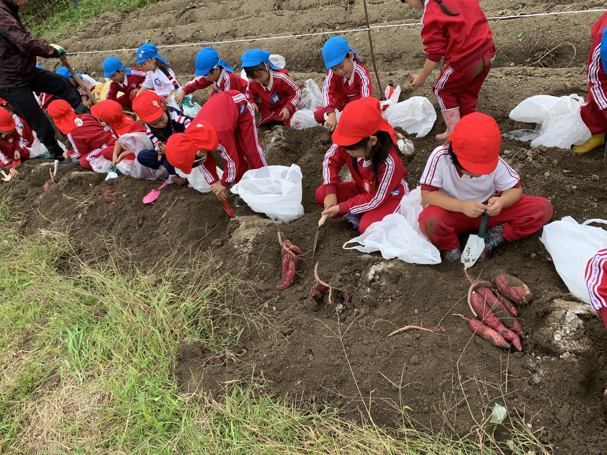 お芋掘りの場所に到着し、順番に自分の場所に行き…いざ!