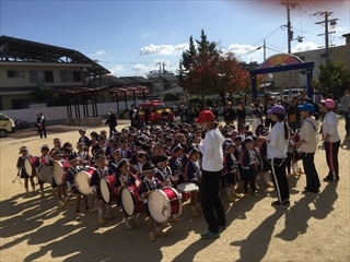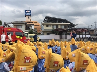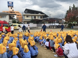 その後、先生のお話をよく聞き、煙を吸わない様にマスクやハンカチで口を押さえて急いで園庭に避難しました!