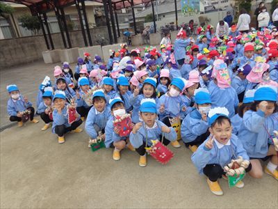 「早く木になれ 柿の種〜 ならぬとハサミでちょんぎるぞ〜♪」と皆で歌い、