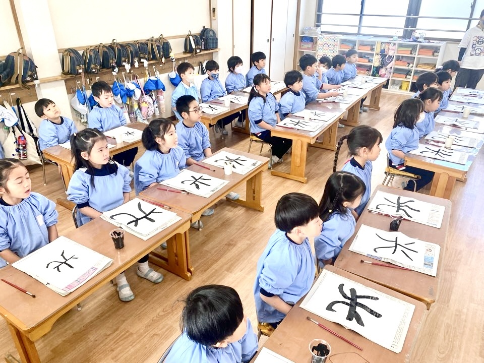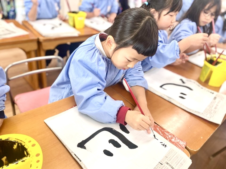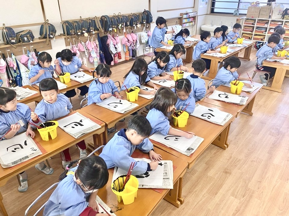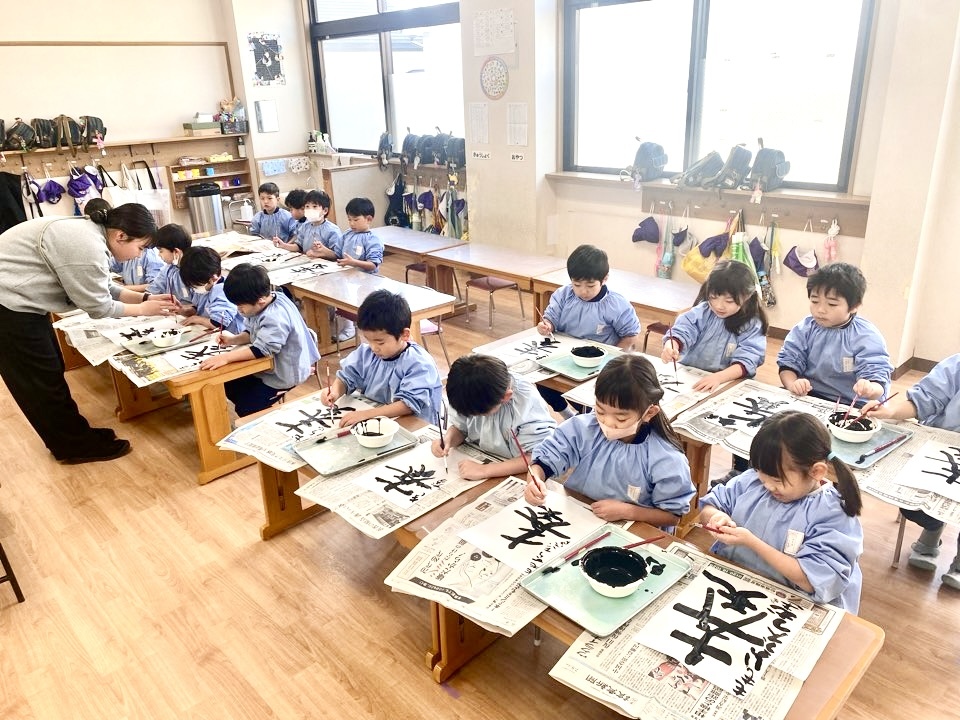 昨日から給食も始まり、今日は年長のみんなで書き初めをしました!
