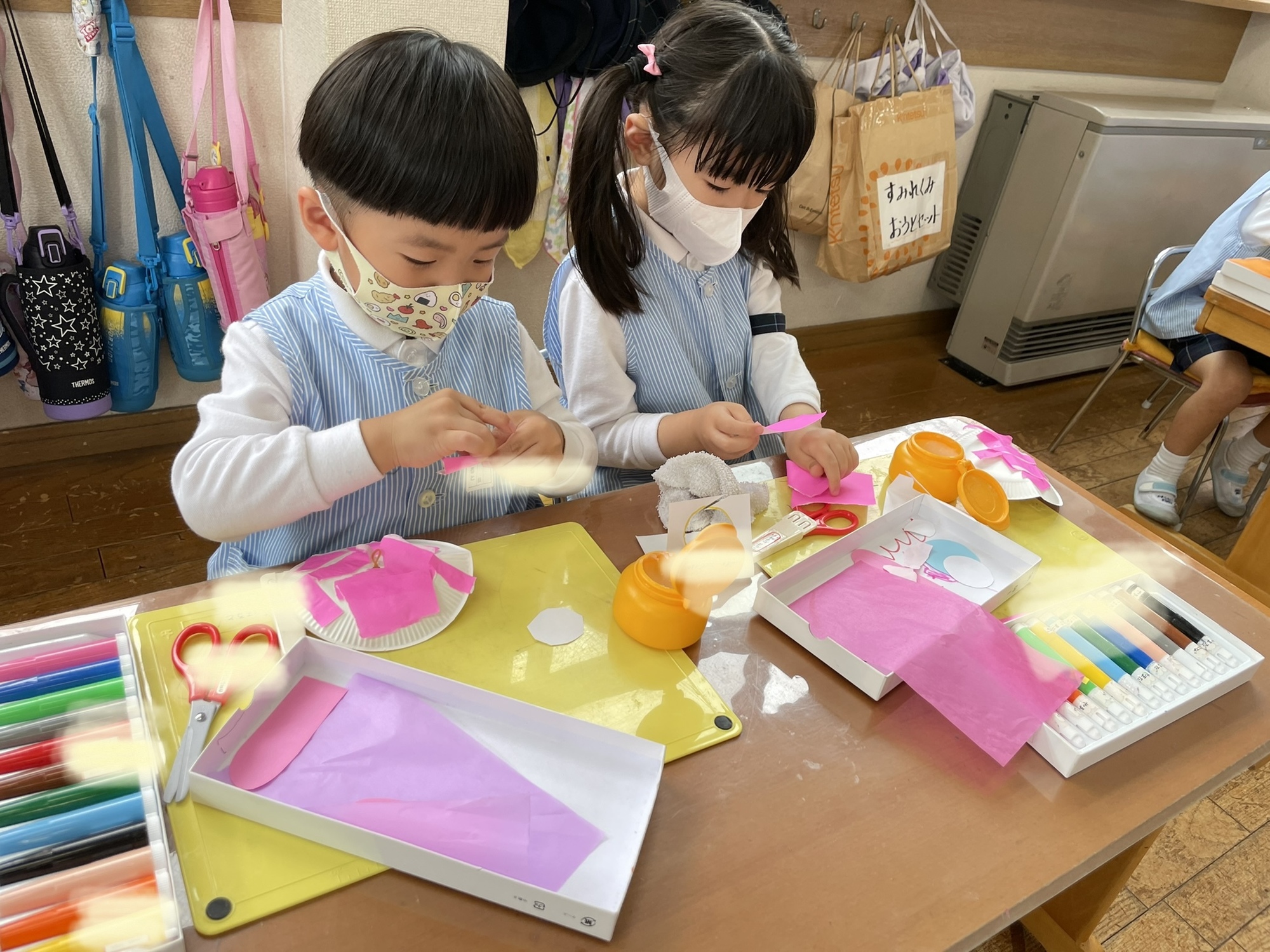 すみれ組さんに入ってくれている実習生さんが、カスタネットの作り方を教えてくれました(^ν^)
