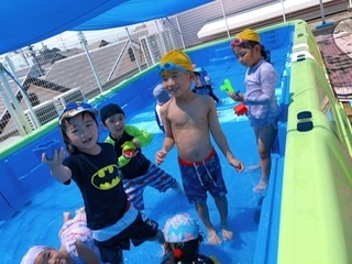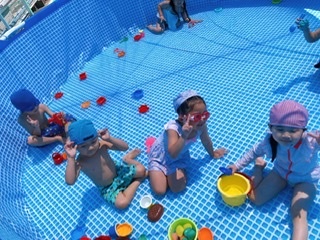 お日様が照る中、冷たいプールの水に「きゃーー!」「きもちいいー!!」と大はしゃぎ☆