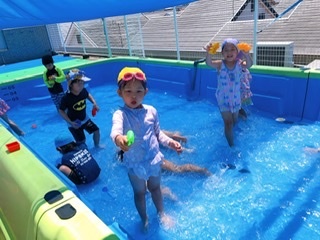 水をかけ合いっこしたり、ワニさん歩きで競争したり、おもちゃで遊んだりと、思いっきり水に触れて楽しんでいました(o^^o)