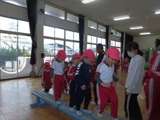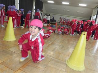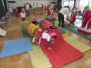 待ちに待ったヒデちゃん先生の体育指導!今日はお天気が悪かったので、ホールでサーキット遊び(^▽^)/