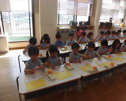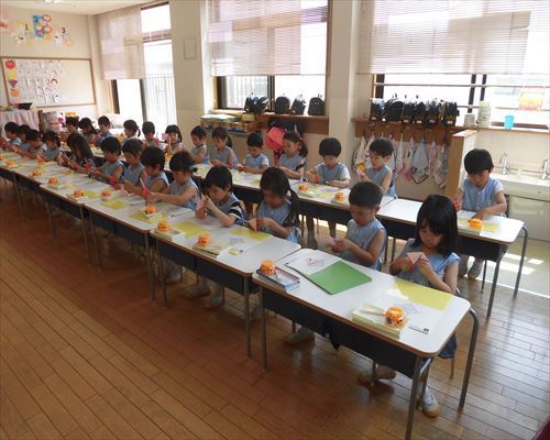 6がつにはいり、暑い日が続いています。園内着を重ねると益々暑くなるので、登園した子どもたちは、ポロシャツを脱いで、下着の上に園内着を着ます。脱いだポロシャツもきれいにたためるようになりました。