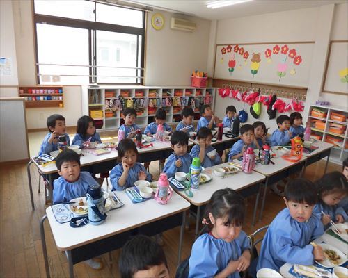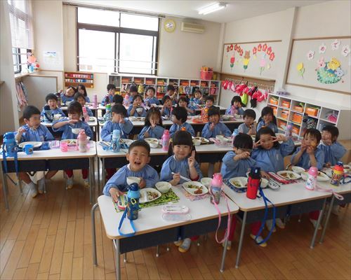 給食が始まりました。食べ物の働きの話をすると、「なんか、お肌がピッカピッカになってきたー」なんて言いながら食べてくれています。苦手な食材も楽しみながら、ゆっくりと克服していけたら良いですね。もっともっと『べっぴんさん』と『ハンサムさん』になるぞ‼