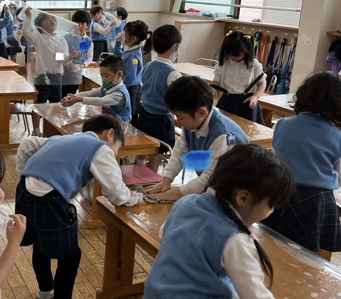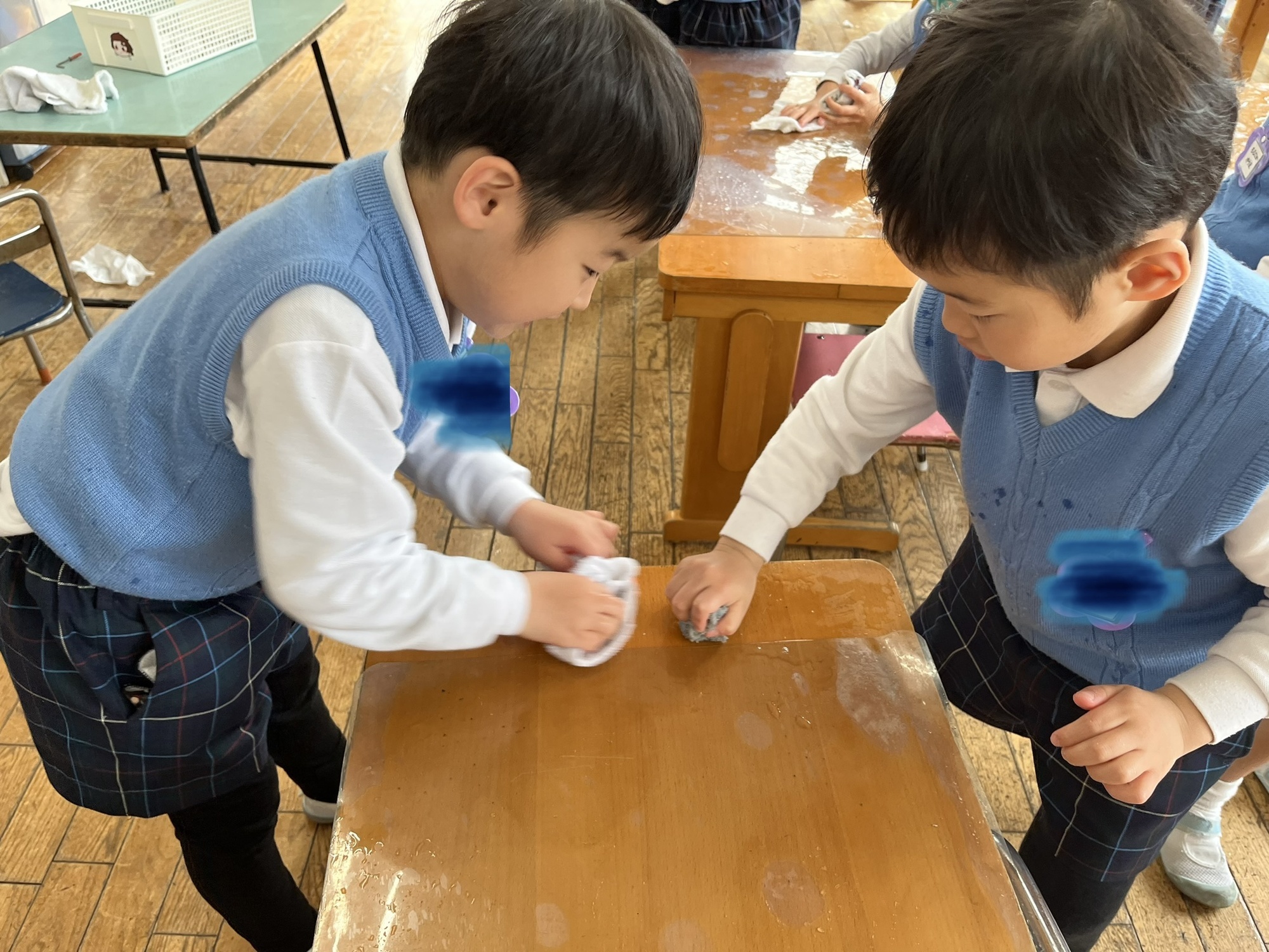 最後は一年間お世話になったお部屋を大掃除!机や机カバー、ロッカーなどキレイにし、次のすみれぐみさんの為に一生懸命掃除をしました。