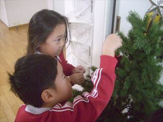 お部屋でもクリスマスツリーを出して子どもたちと飾りつけをしました。