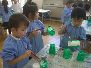 まずは緑の絵の具を塗りました。そして乾いたら、コップに切り込みを入れていきました。