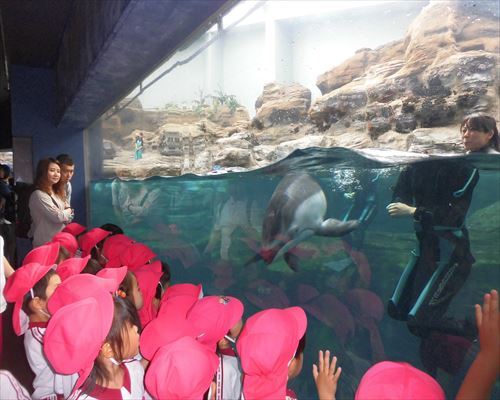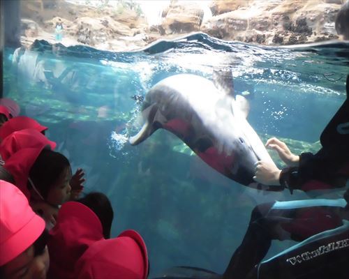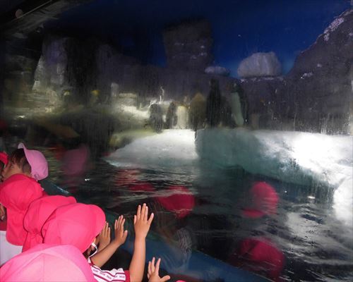イグアナさんに挨拶したり、イルカさんが「こんにちわ!こんにちわ!」って挨拶してくれたり。前にマンタの真白なお腹が来たり、とっても大きくてカッコイイ、ジンベイザメや、かわいいペンギンさんに、もう興奮しっぱなしのこどもたちでした。