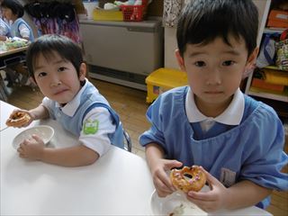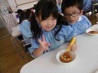 ドーナツを見た瞬間、皆は「きゃぁー、おいしそう♡」「良いにおい♡」とにこにこっ!