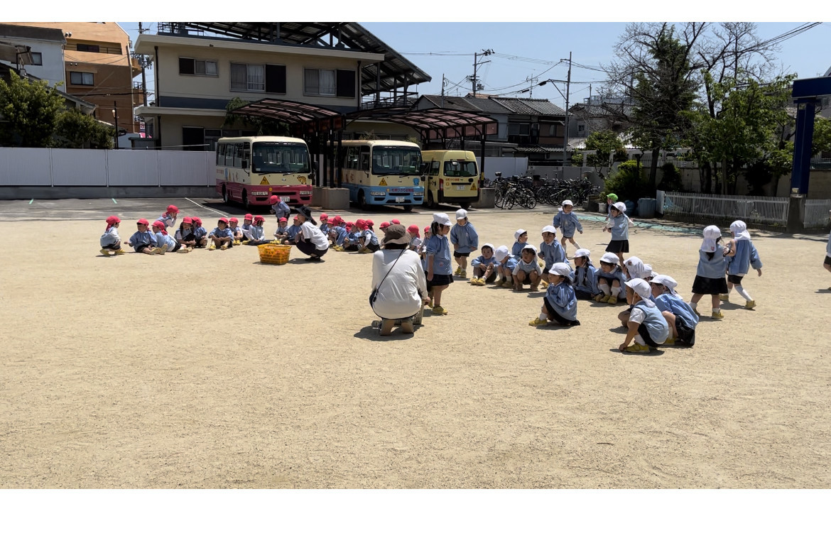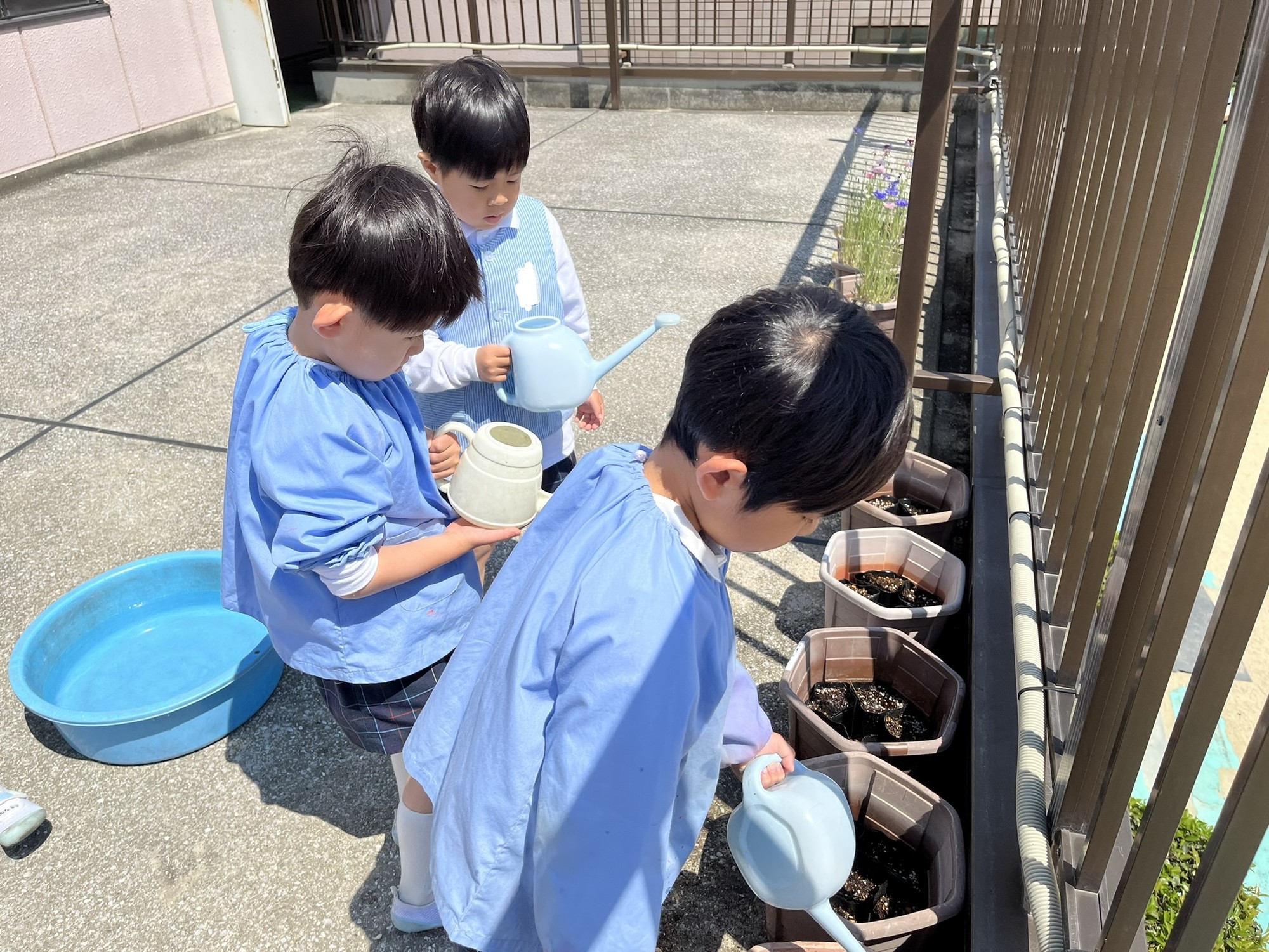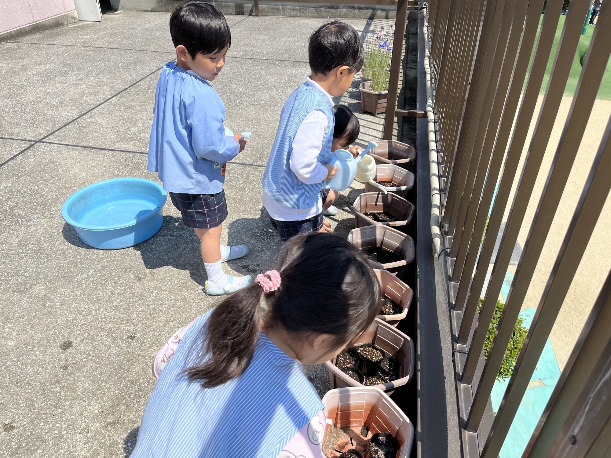 まず最初は年中さんみんなで夏野菜の種を植えました。きゅうり、とまと、なす、などを植え、毎日グループ毎に水やりをしています。「今日は〇〇グループが水やりやで!」と自分のグループが来るのを楽しみに待っています(*≧∀≦*)