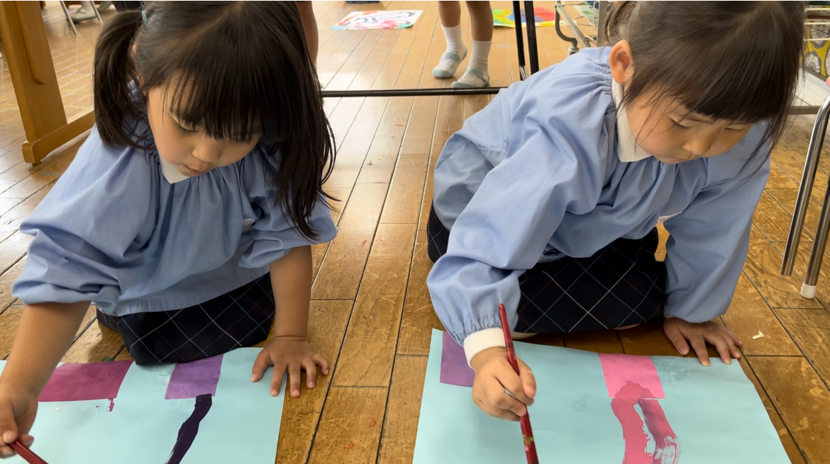 えのぐで描いた後はクレパスで匂いの元の果物を空いている所に描きました!