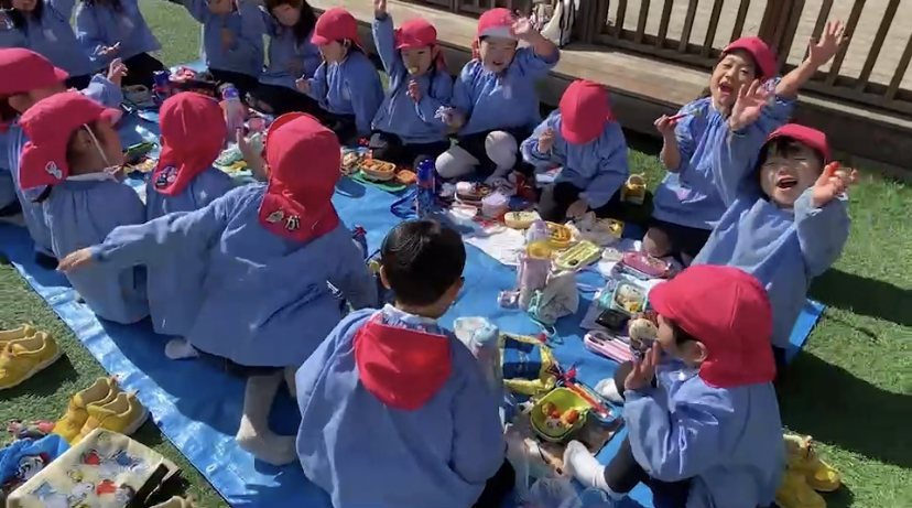 年中組4クラス園庭で食べることになり
