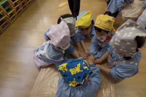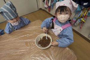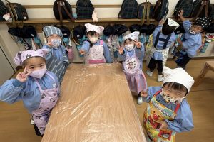 エプロンを着るのもお家で練習してきた成果か「先生エプロン自分で着れるで!」と見せてくれました☆