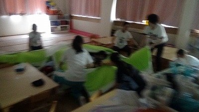 このあと、ミサイルが発射され、5分後に上空を通過するという設定で、また全園児1階保育室に入り、窓・とびらなを全部閉めて身を守りました。
