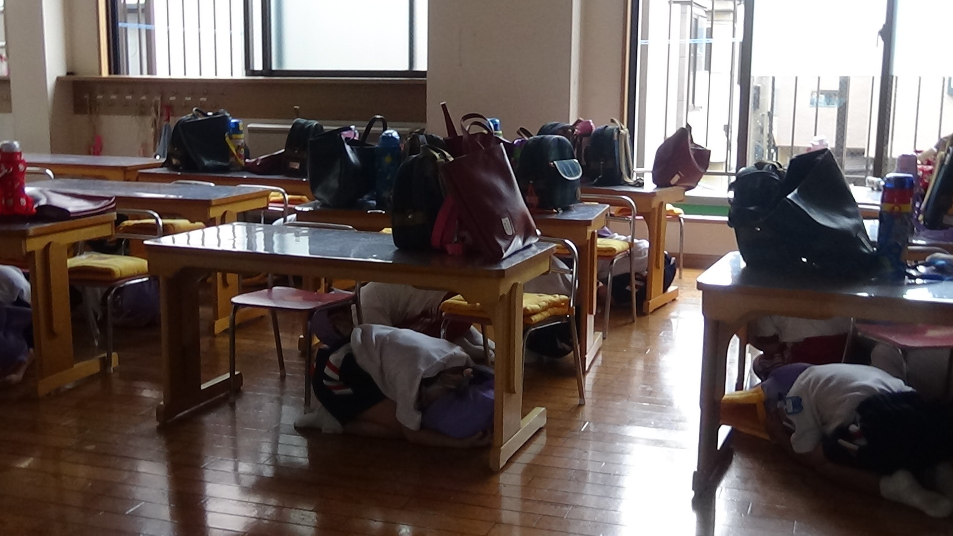 地震です!という放送がかかったら、すかさず机の下にもぐる、防災頭巾をかぶるという行動が