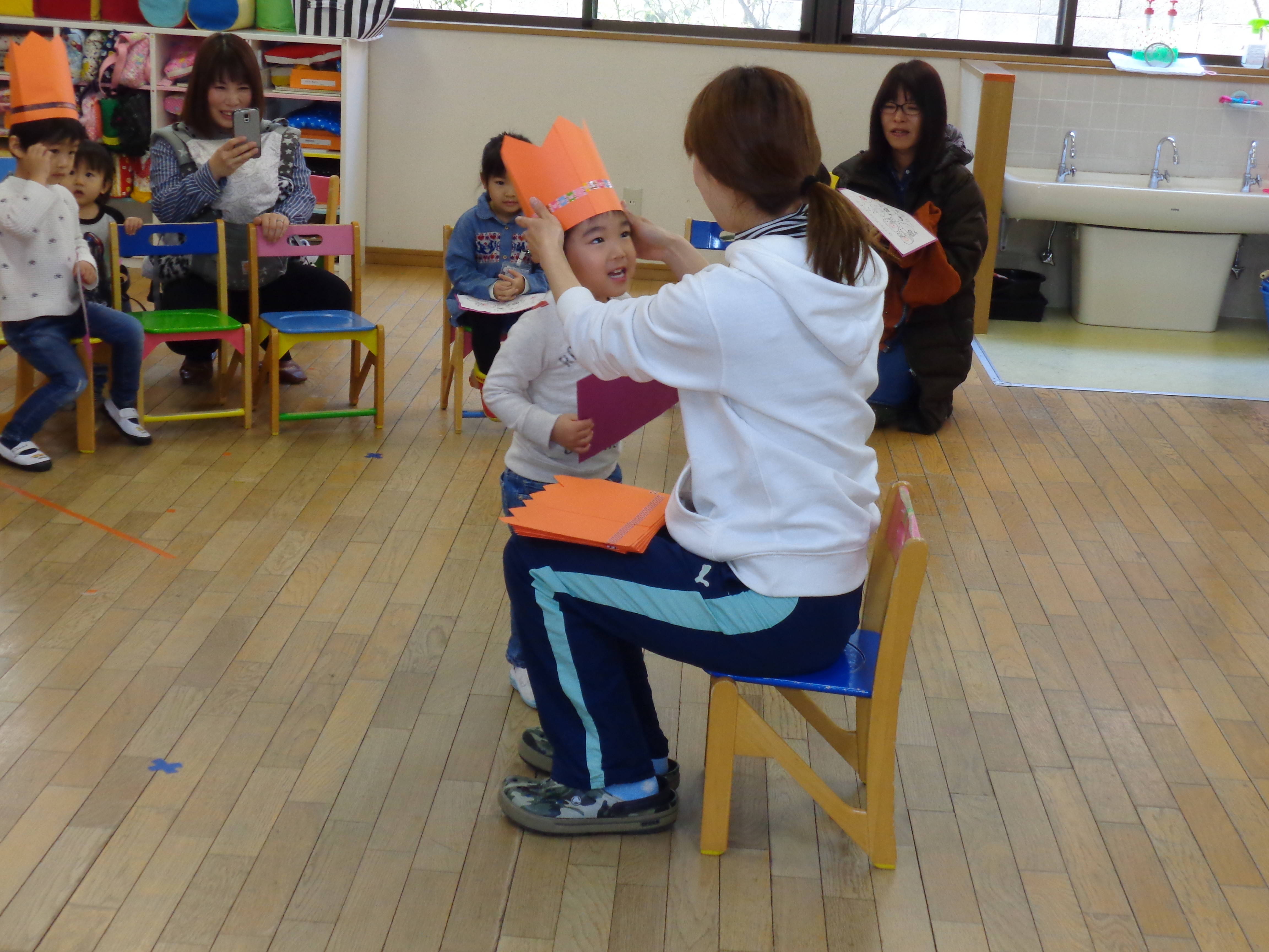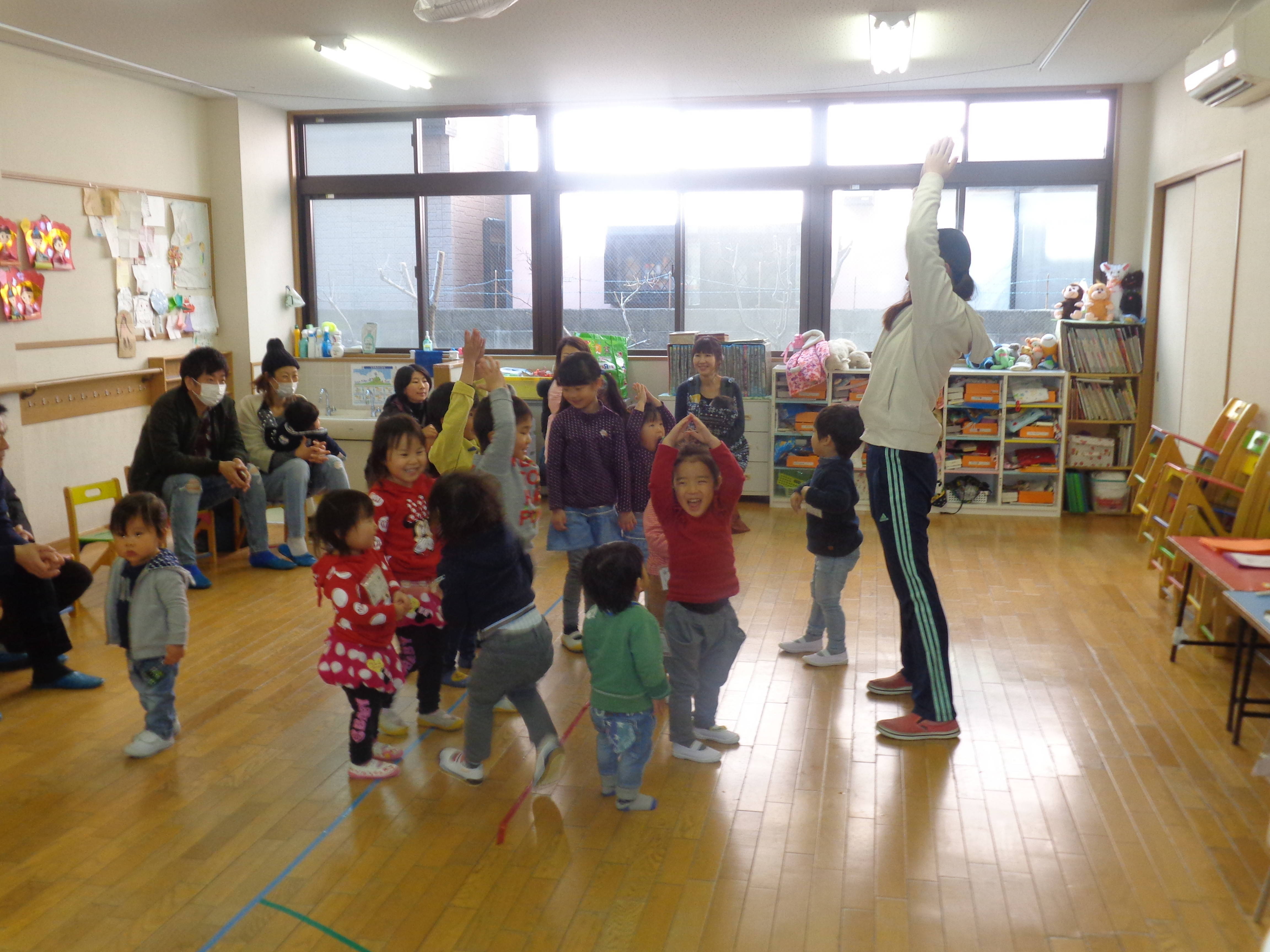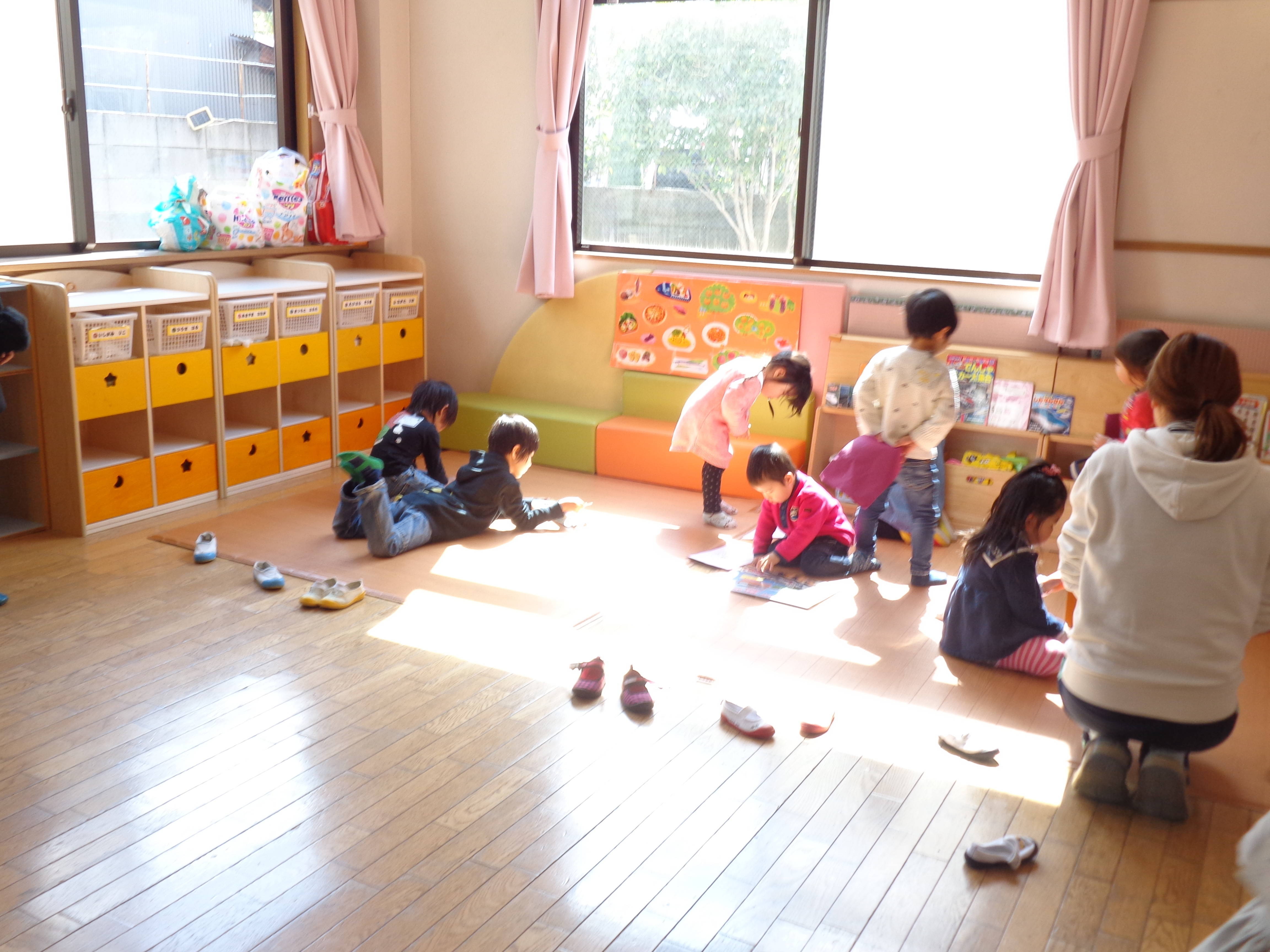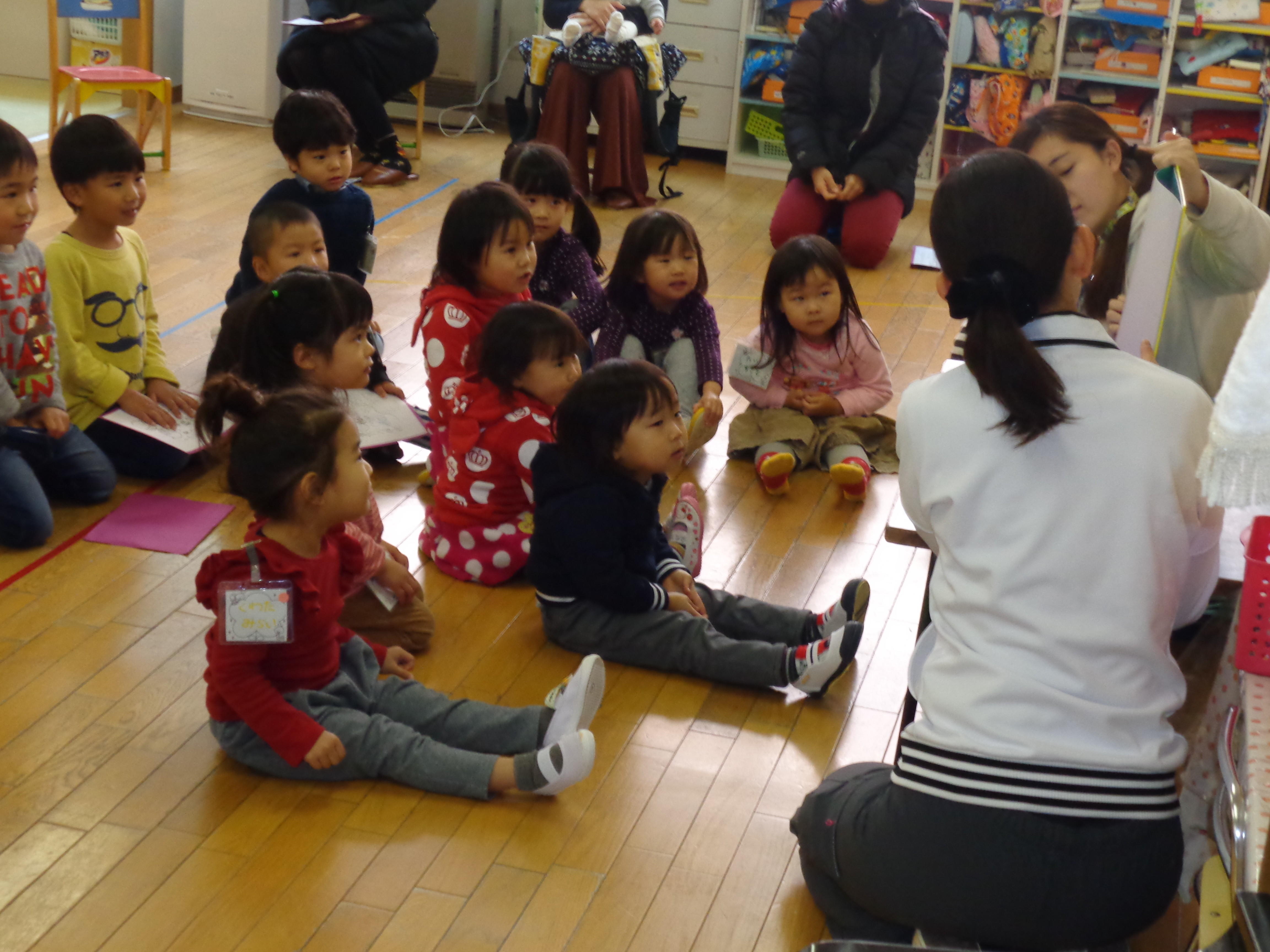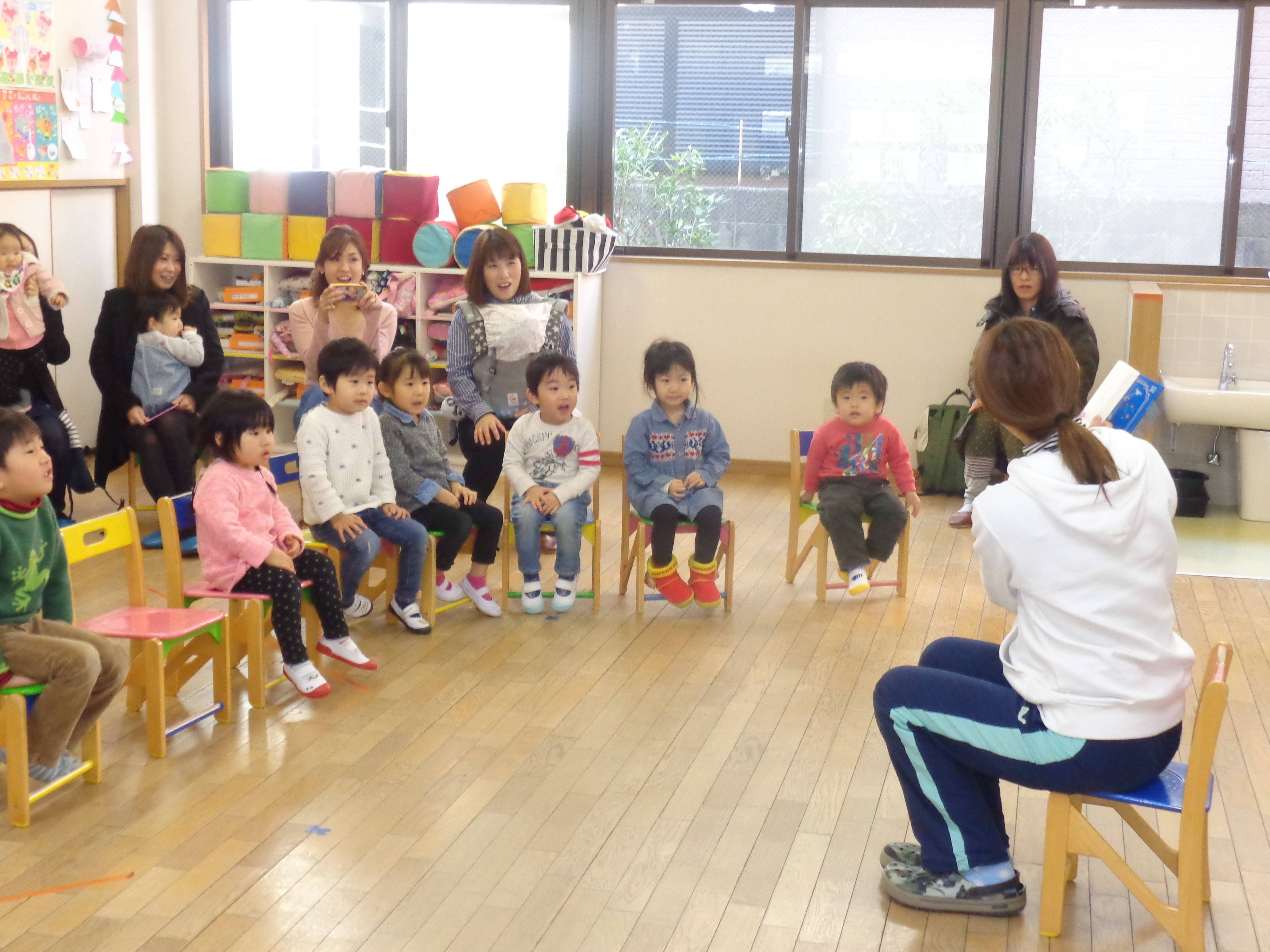 元気に挨拶をしてお部屋に入り、歌を歌ったり絵本の読み聞かせを聞いたりして楽しみました。