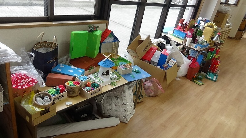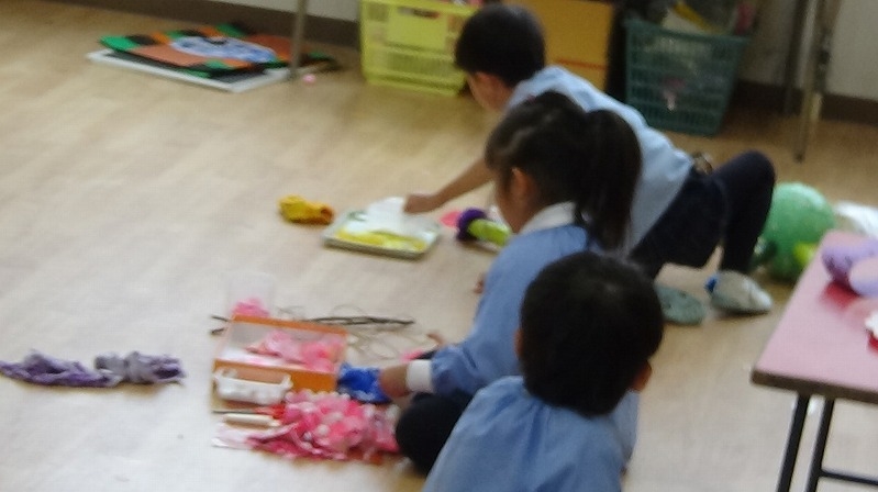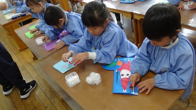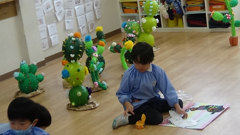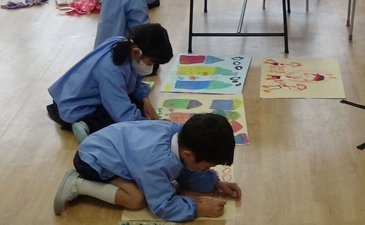 今幼稚園では、週末の作品展に向けて最後の仕上げをしています。