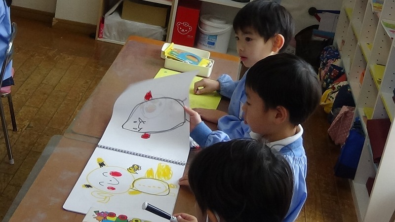 お絵描きをする子ども、制作をする子ども、おもちゃで遊ぶ子ども、、、同じお部屋でそれぞれ活動をしています。