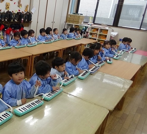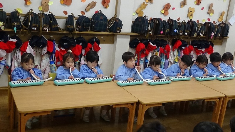 壁には11月に作ったもの、ろうかや保育室には作品展の作品が並べられ、そんな中でもスマートキッズをしたり歌を歌ったりメロディオンを弾いたり、普段の保育をしています。
