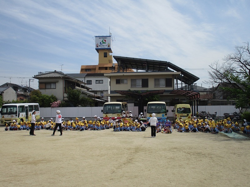 今日は1回目なので、園庭に避難し、お話を聞きました。